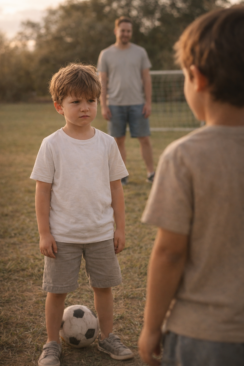 Um menino de oito anos está jogando futebol com os amigos.