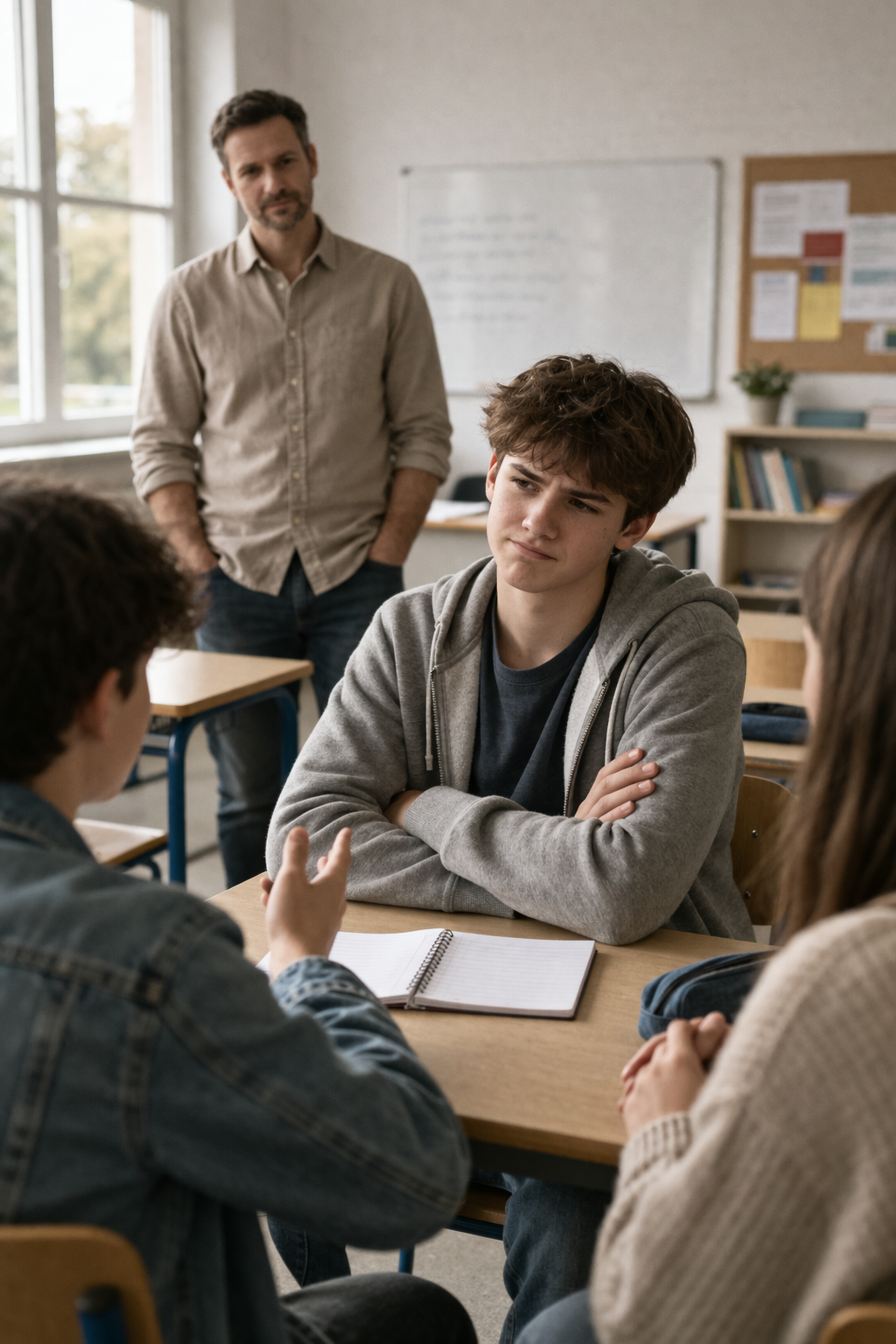 Um adolescente está conversando com amigos quando alguém faz um comentário que ele interpreta como crítica.
