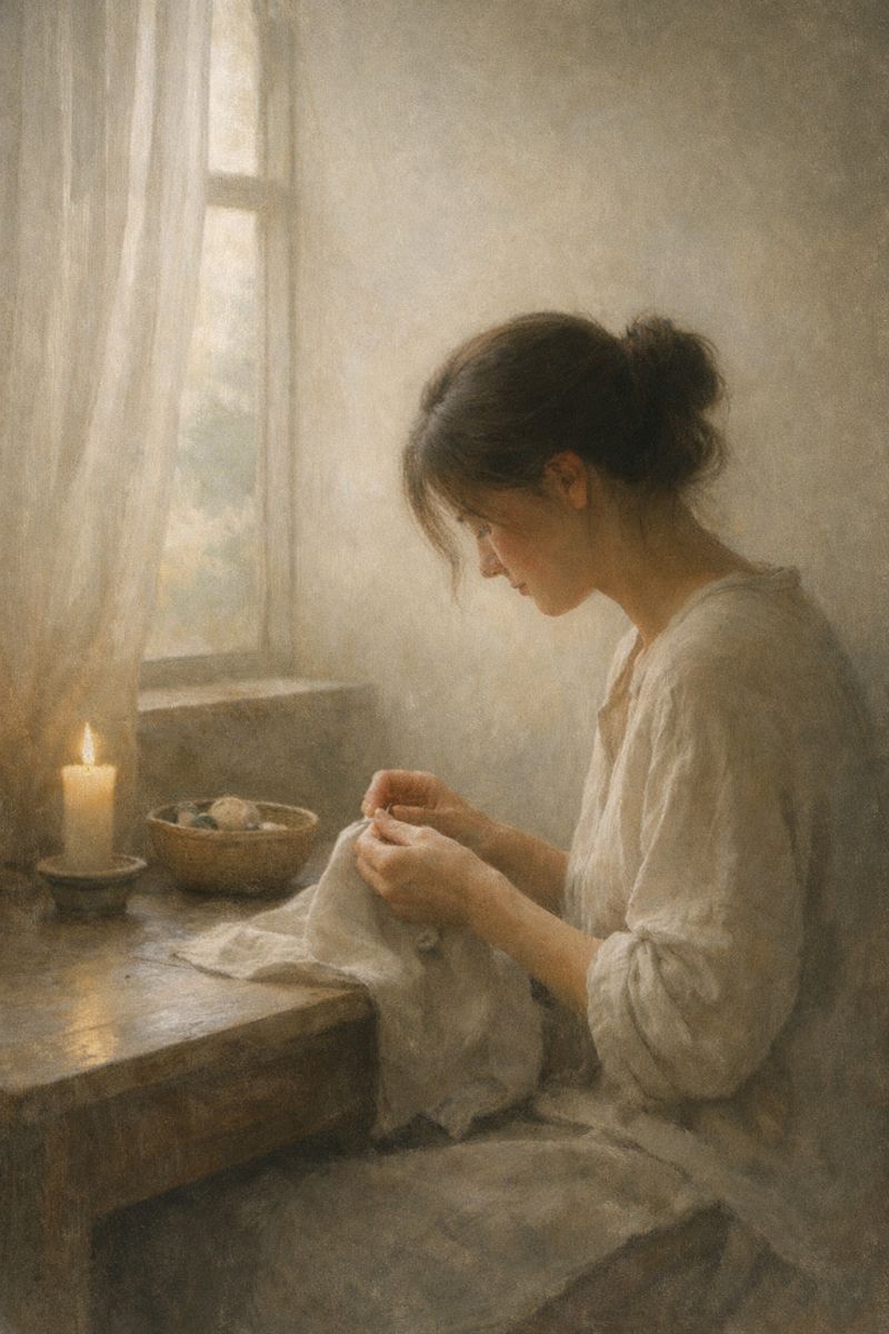 Mulher costurando à luz